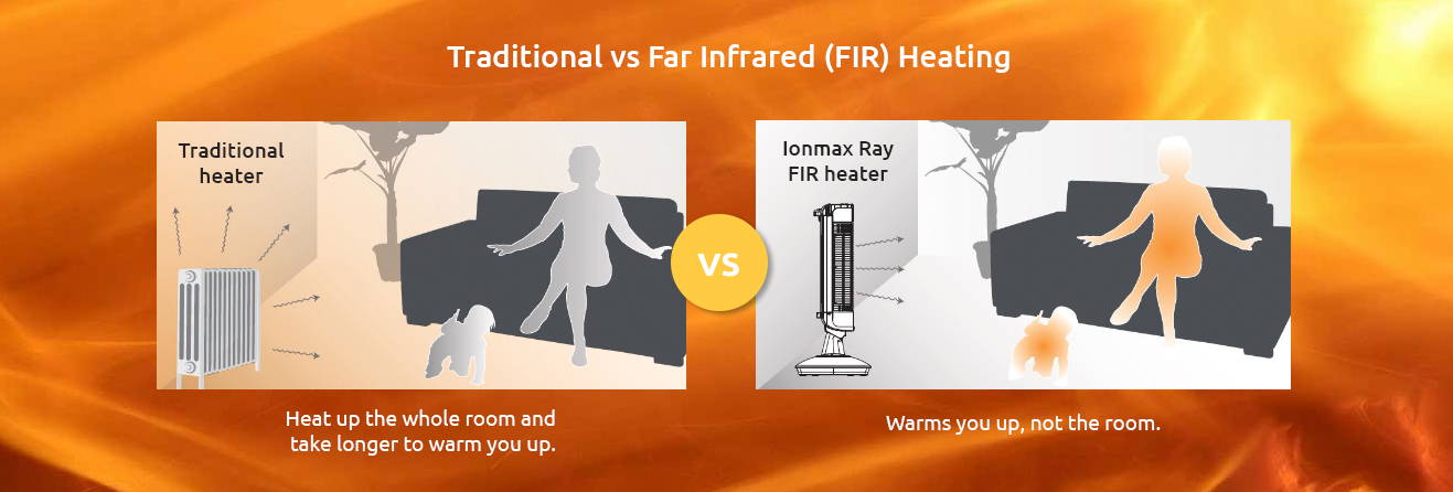 Compared to traditional heaters that warm up a whole room, FIR heaters warm people up, making heating much faster and therefore needs a lot less time to get you warm.